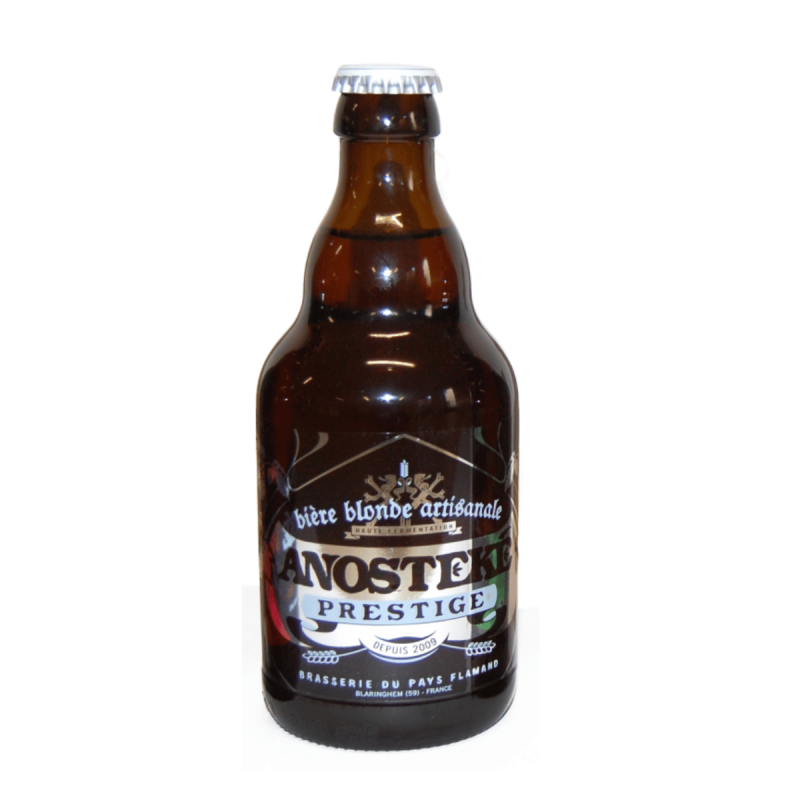 L'Anosteké Prestige est une bière ambrée d'exception, brassée avec passion dans le Nord de la France par la Brasserie du Pays Flamand. Moins connue que l'Anosteké Blonde, cette bière n'en est pas moins savoureuse. Elle est inspirée des bières fortes belges, brassée à proximité, et présente une couleur jaune cuivrée captivante, surmontée d'une mousse blanche qui invite à la dégustation.